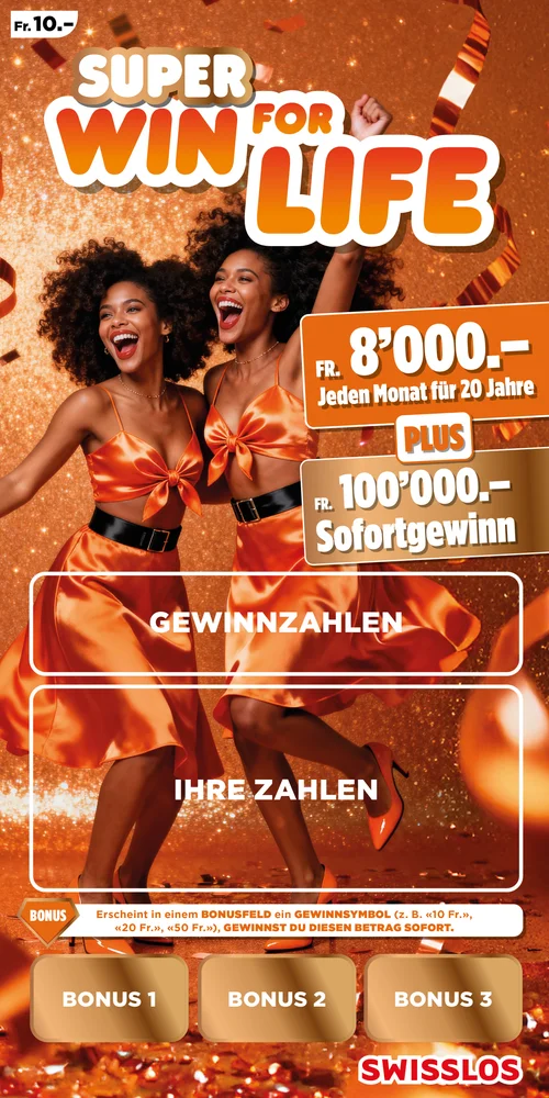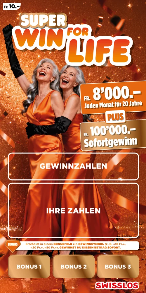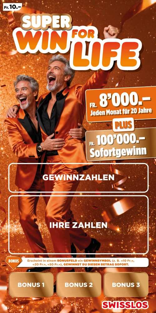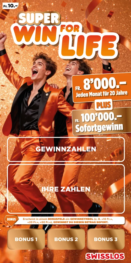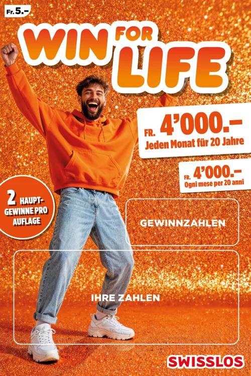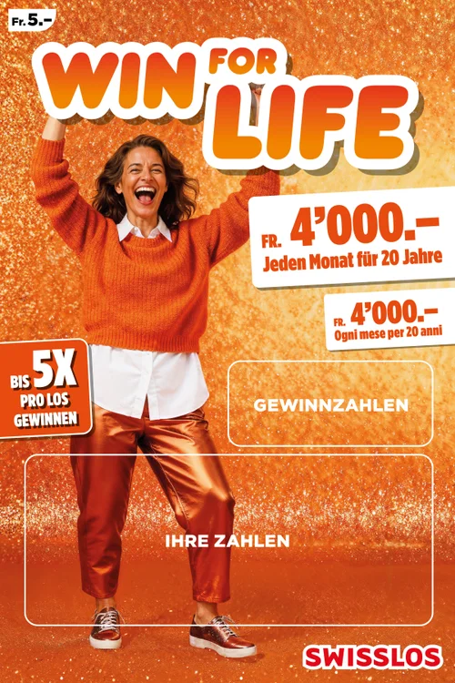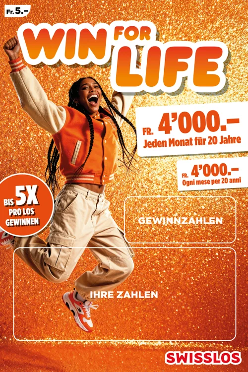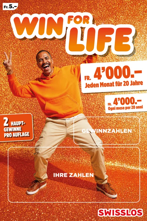 Mit Win for Life gewinnen Sie nicht nur einmal. Nein, Sie gewinnen 20 Jahre lang Monat für Monat 4'000 oder 8’000 Franken! Eine lang ersehnte Reise verwirklichen, in sein Hobby investieren oder einfach das Leben sorgloser leben? Mit Win for Life ist es möglich.